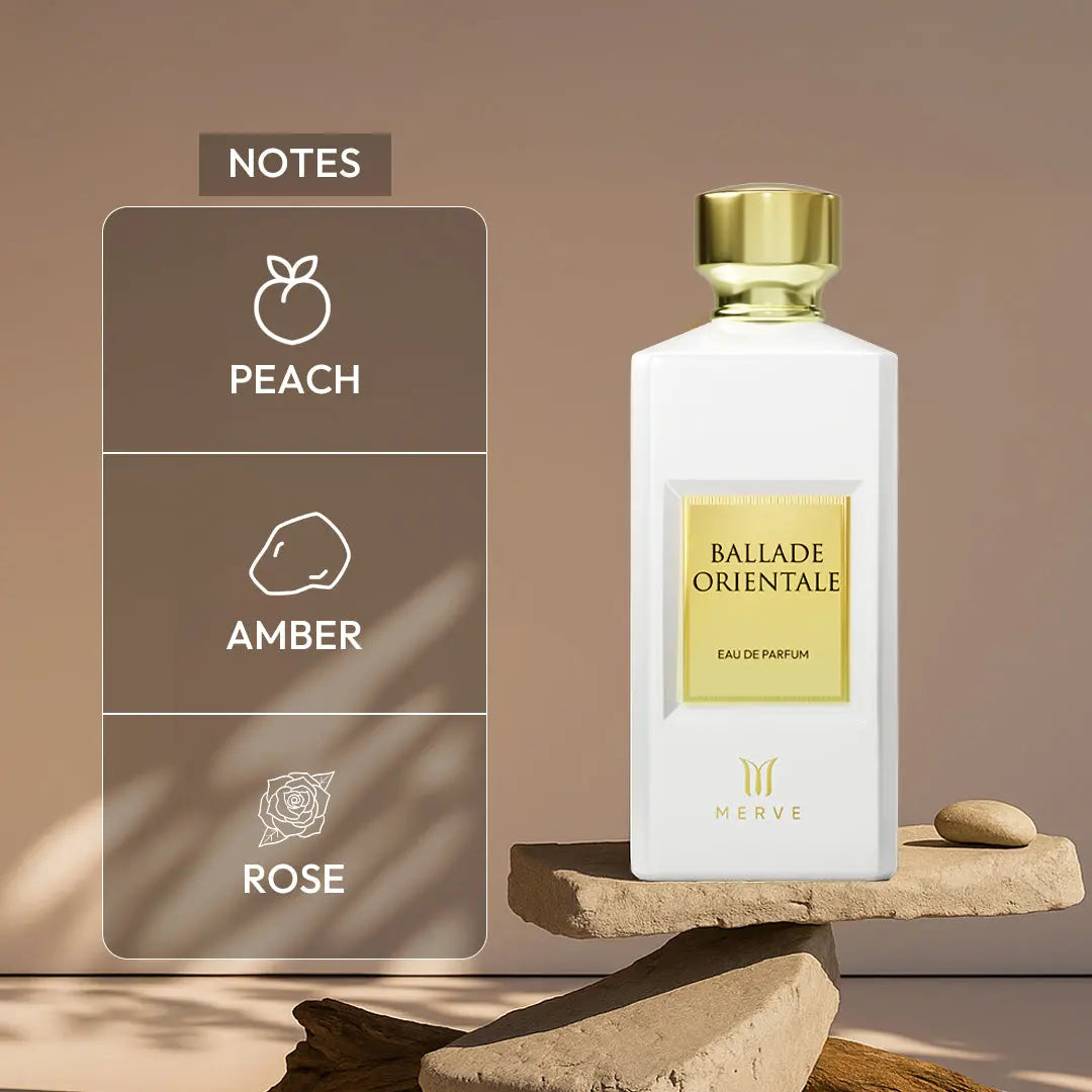 A melodious journey through orchards of peach and apricot, guided by the enchanting notes of Madagascar vanilla and amber. As musk and sandalwood intertwine, it becomes a refined ode to the mystique of the East.